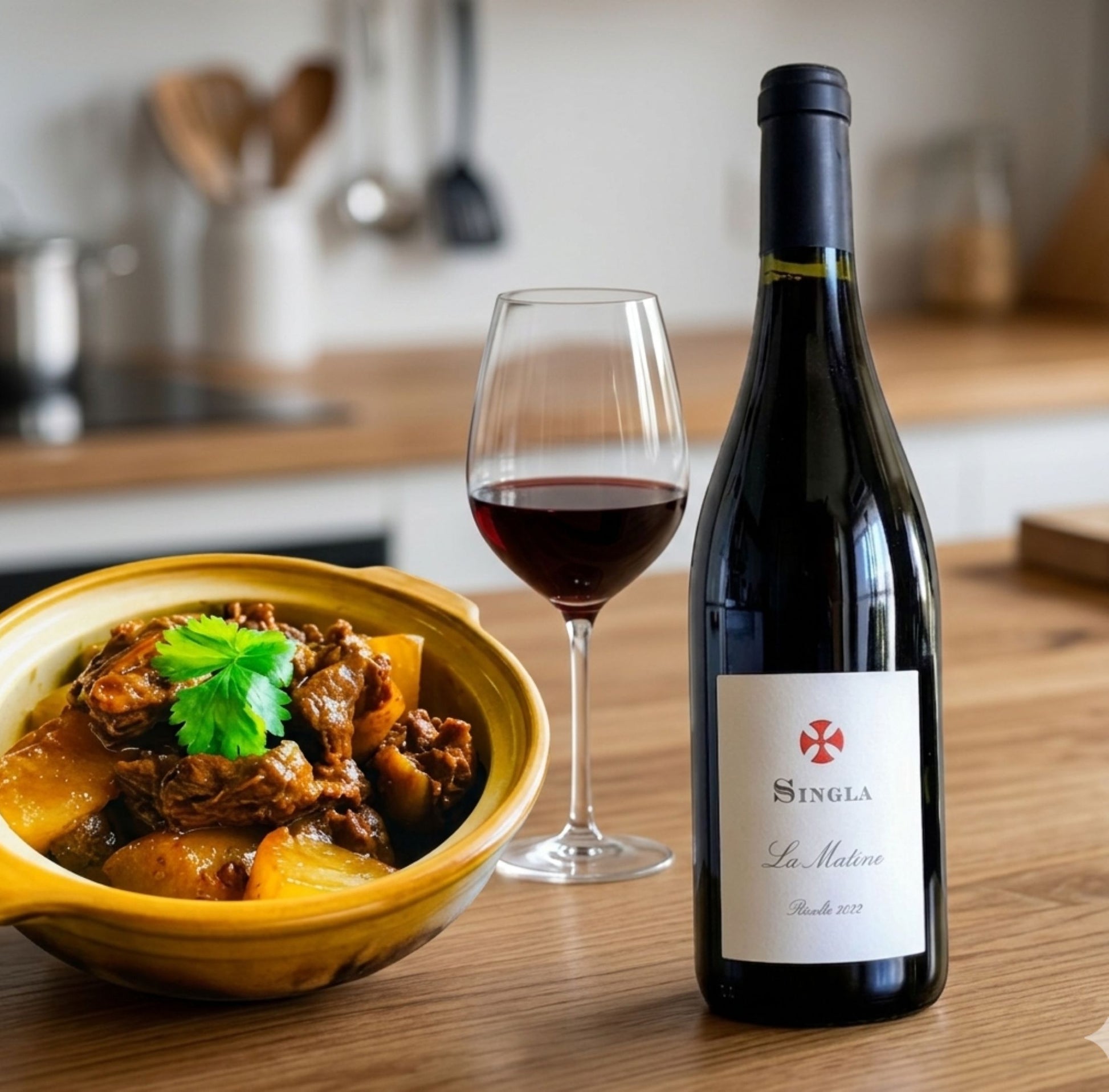 南仏ルーション、サルス・ル・シャトーに近い赤土と粘土石灰岩が混じり合う豊かなテロワールで育まれた3種のブドウを巧みにブレンドした赤ワイン「ラ・マティン」と、